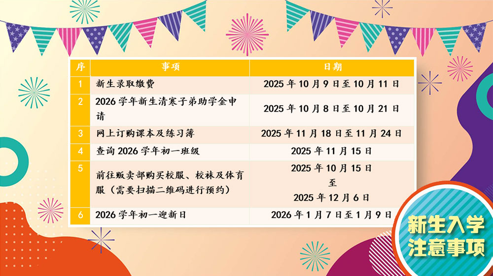 家长与小六考生可浏览本校校网(https://www2.chonghwakl.edu.my/allpub/entry/results.aspx)查询新生录取名单与网上购书指南,请已录取报考生家长尽速到本校办理入学登记手续,并领取录取通知书,所缴费用为1620令吉(其中包括新学年初一新生第一期学费、学号、簿子、教育发展基金及迎新日费),缴费日期为2025年10月9日至10月10日,时间为上午七时三十分至下午二时正;2025年10月11日,时间为上午七时三十分至下午一时正,地点为本校光前堂。另外,本校将于2026年1月7日至1月9日举办为期三天的“2026学年初一迎新日”,迎新日为正式上课日,全体新生务必穿着整齐校服参加活动。