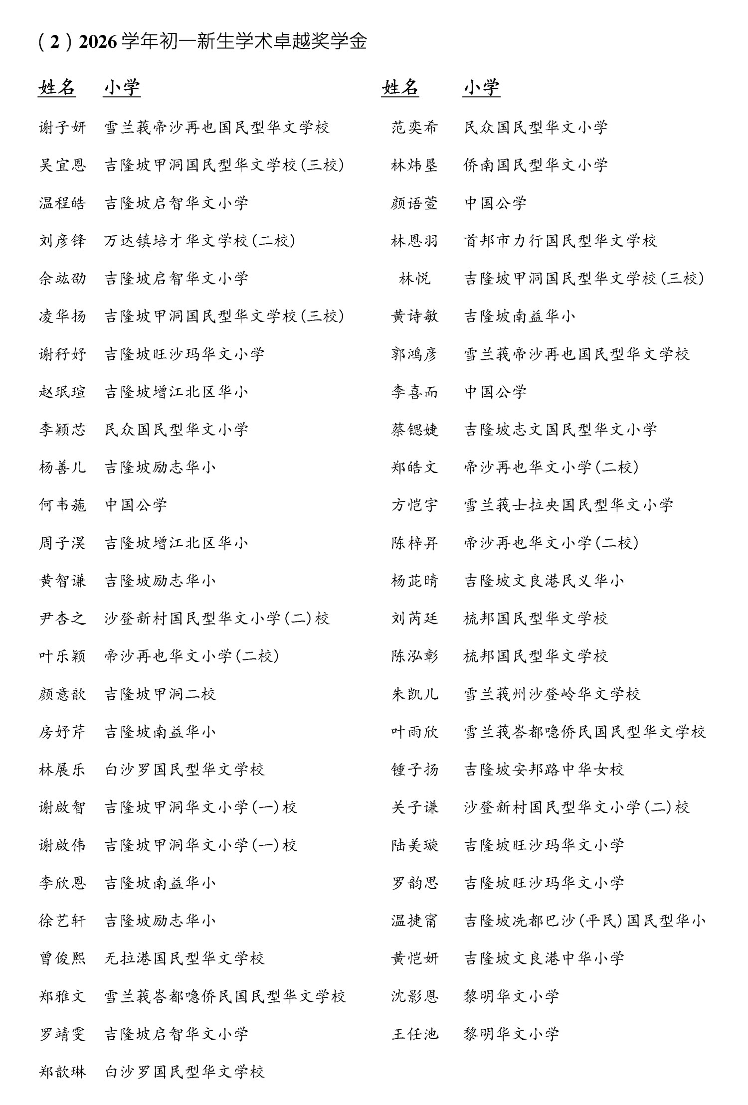 (2)2026学年初一新生学术卓越奖学金