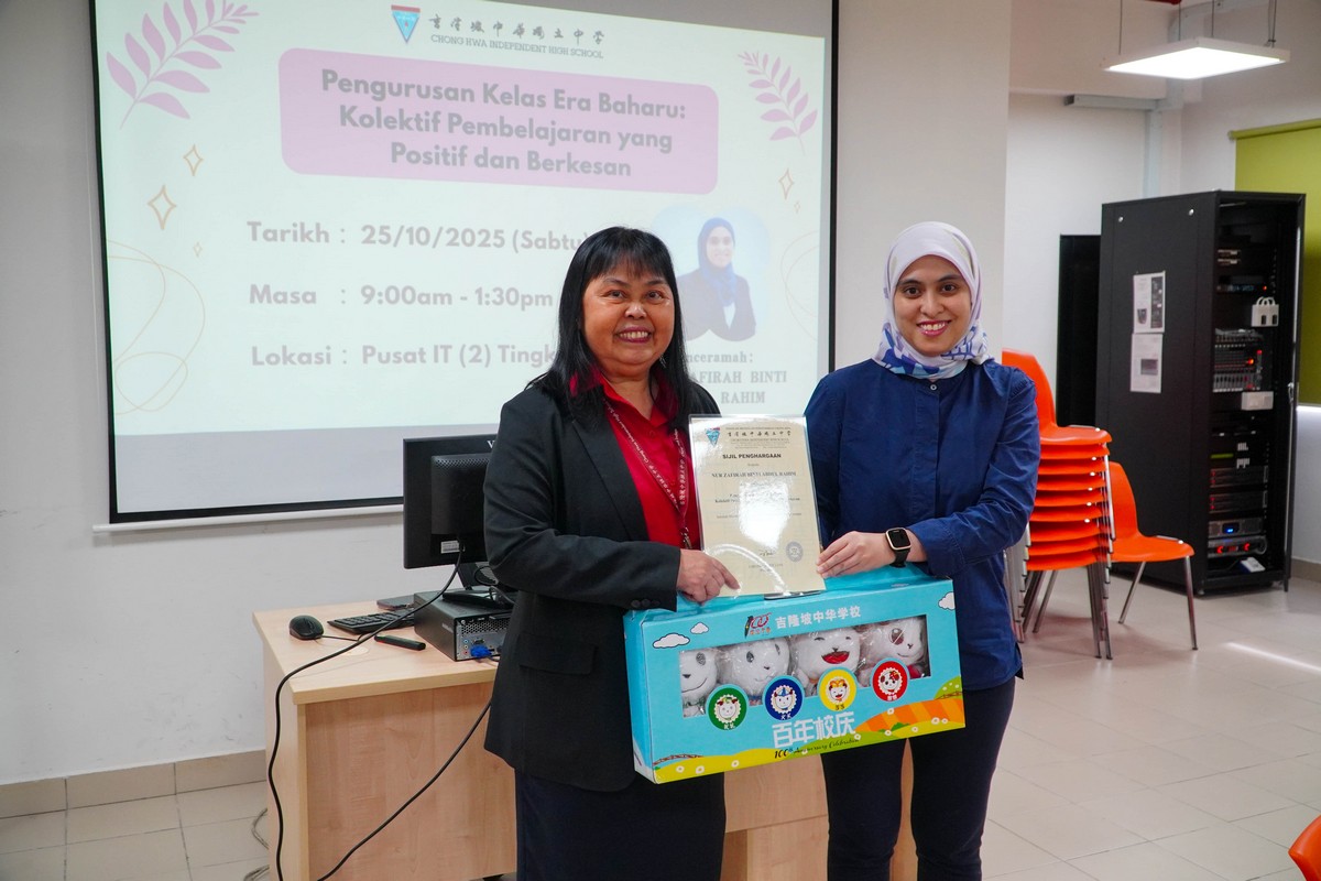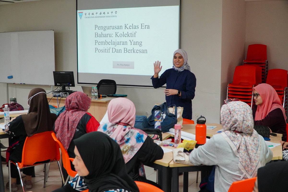 此外,本校亦邀请 Nur Zafirah binti Abdul Rahim 主讲“Pengurusan Kelas Era Baharu: Kolektif Pembelajaran Yang Positif Dan Berkesan”。Nur Zafirah 拥有教育学硕士,曾任 City University 管理与商业学院讲师兼系主任,现任教于 UKM 大学及 Segi 学院。本次培训内容聚焦教师专业角色定位、学生行为管理、学习差异以及家庭背景对学习的影响等议题。Nur Zafirah 指出,新时代学生呈现多元需求,教师不仅要具备扎实的教学能力,更需要同理心与适应力。她强调“先建立关系,再设定规则”的核心理念,并介绍差异化教学(DI)、通用学习设计(UDL)、元认知策略、课堂常规建立以及正向纪律等方法,协助教师有效应对学生注意力分散、学习落差及常见行为问题,打造积极且高效的学习环境。