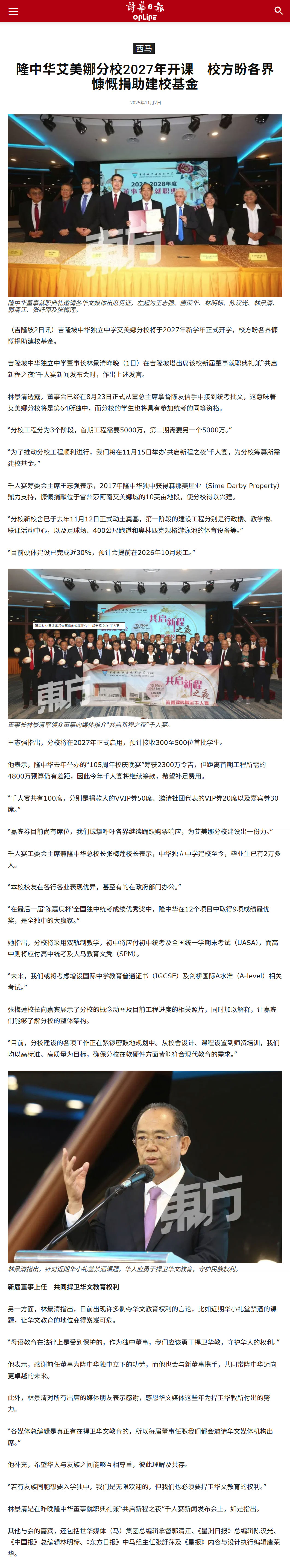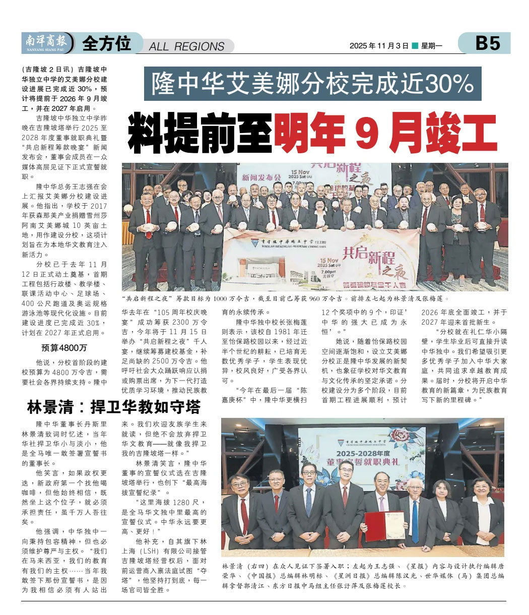 【南洋商报报道】 隆中华艾美娜分校 预计明年9月竣工 后年启用