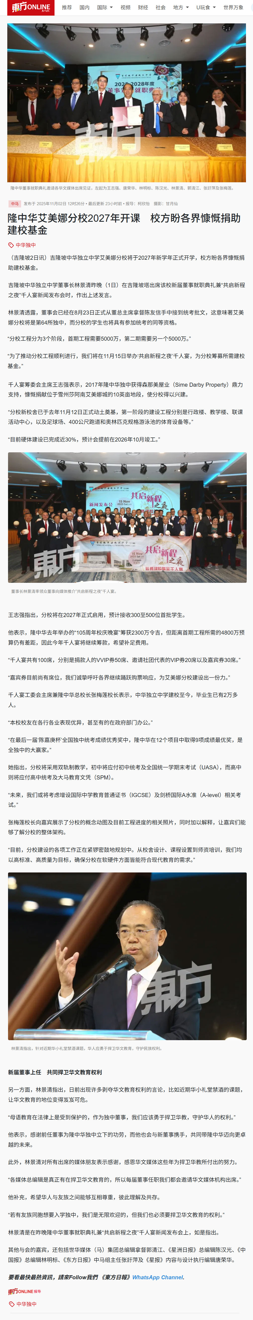隆中华艾美娜分校2027年开课 校方盼各界慷慨捐助建校基金 |