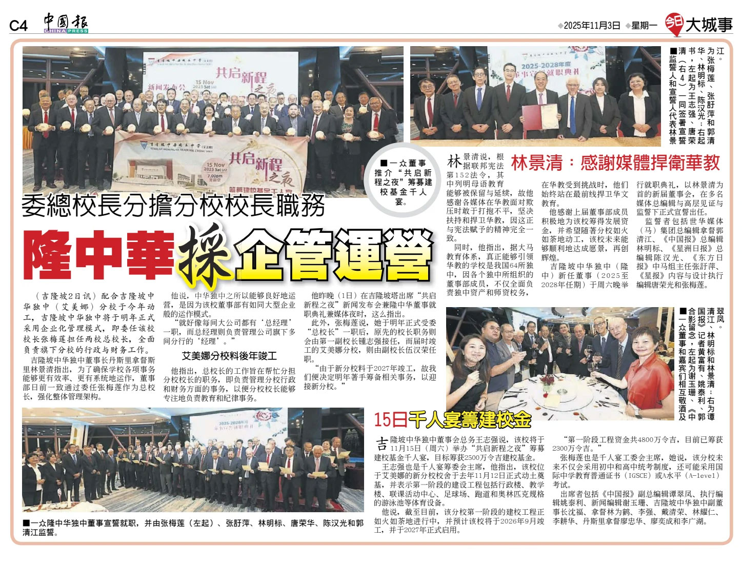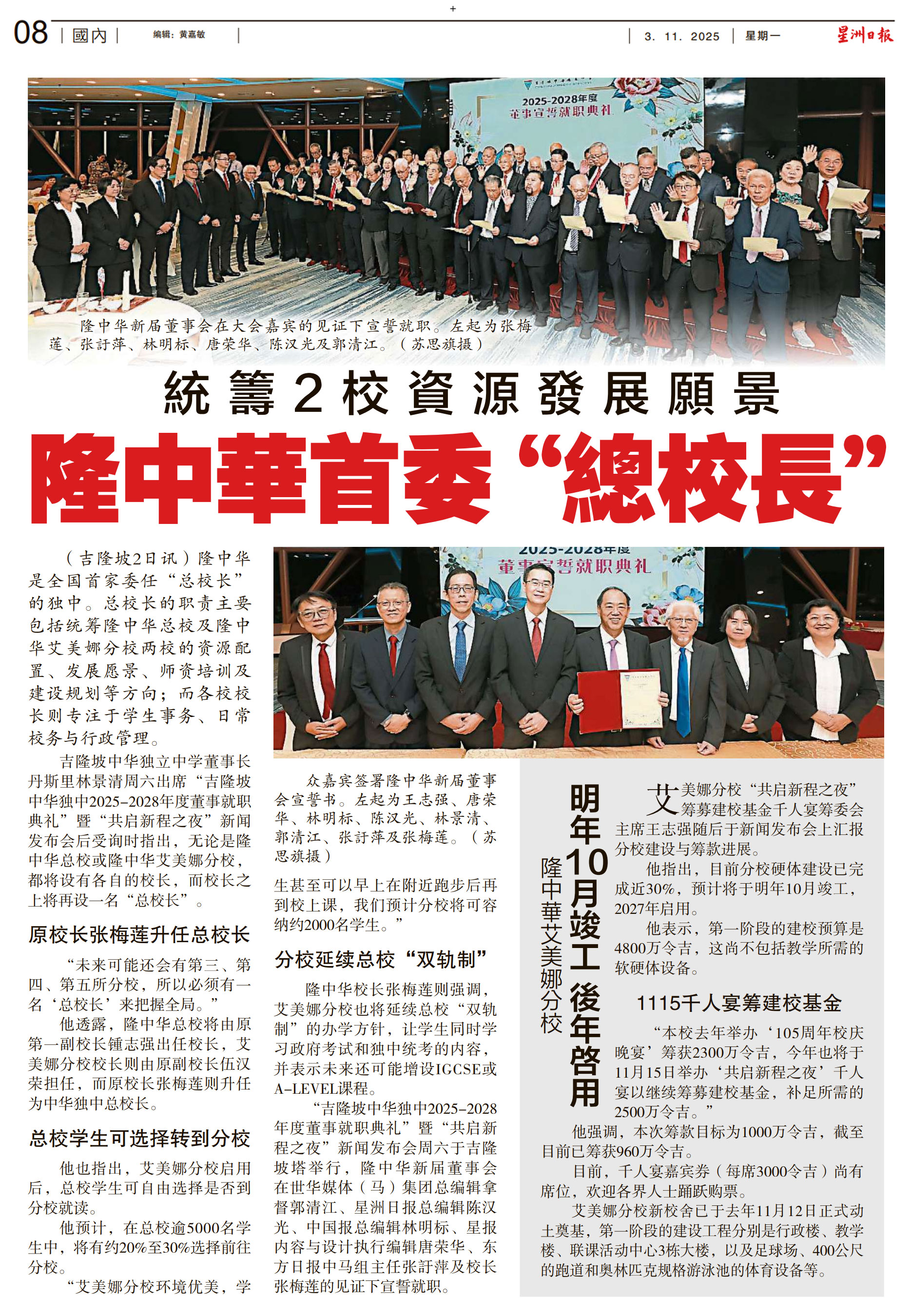 【星洲日报报道】 统筹2校资源发展愿景 隆中华首委“总校长”