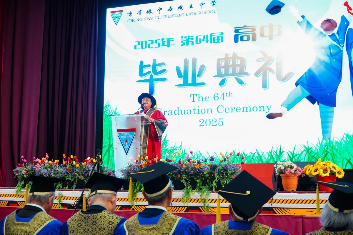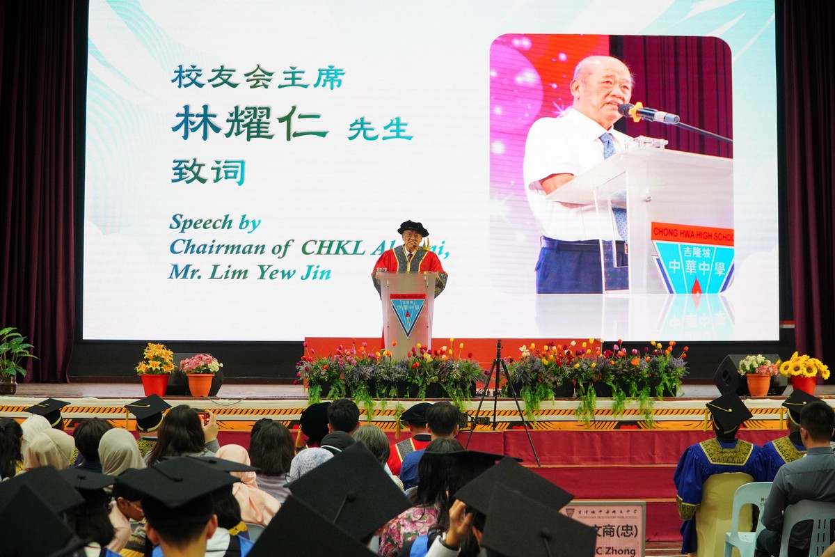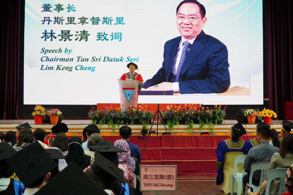 接着,本校董事长丹斯里拿督斯里林景清在致词中勉励毕业生“饮水思源”,懂得感恩父母、感恩师长、感恩母校、感恩国家。他期望毕业生不忘初心,在华教的熏陶下展现良好的道德价值观,并将之融入未来的社会实践中。此外,他强调成绩固然重要,但品德更应放在首位,唯有如此,才能在人生道路上走得更稳、更远。他也希望毕业生在迈入新阶段后,继续支持华教、传承中华文化,让中华人的精神在社会各领域持续发光。毕业不是终点,而是人生另一段崭新旅程的起点,林董事长祝愿所有毕业生未来无惧风雨、勇往直前,在各自的人生舞台上披荆斩棘、乘风破浪。
