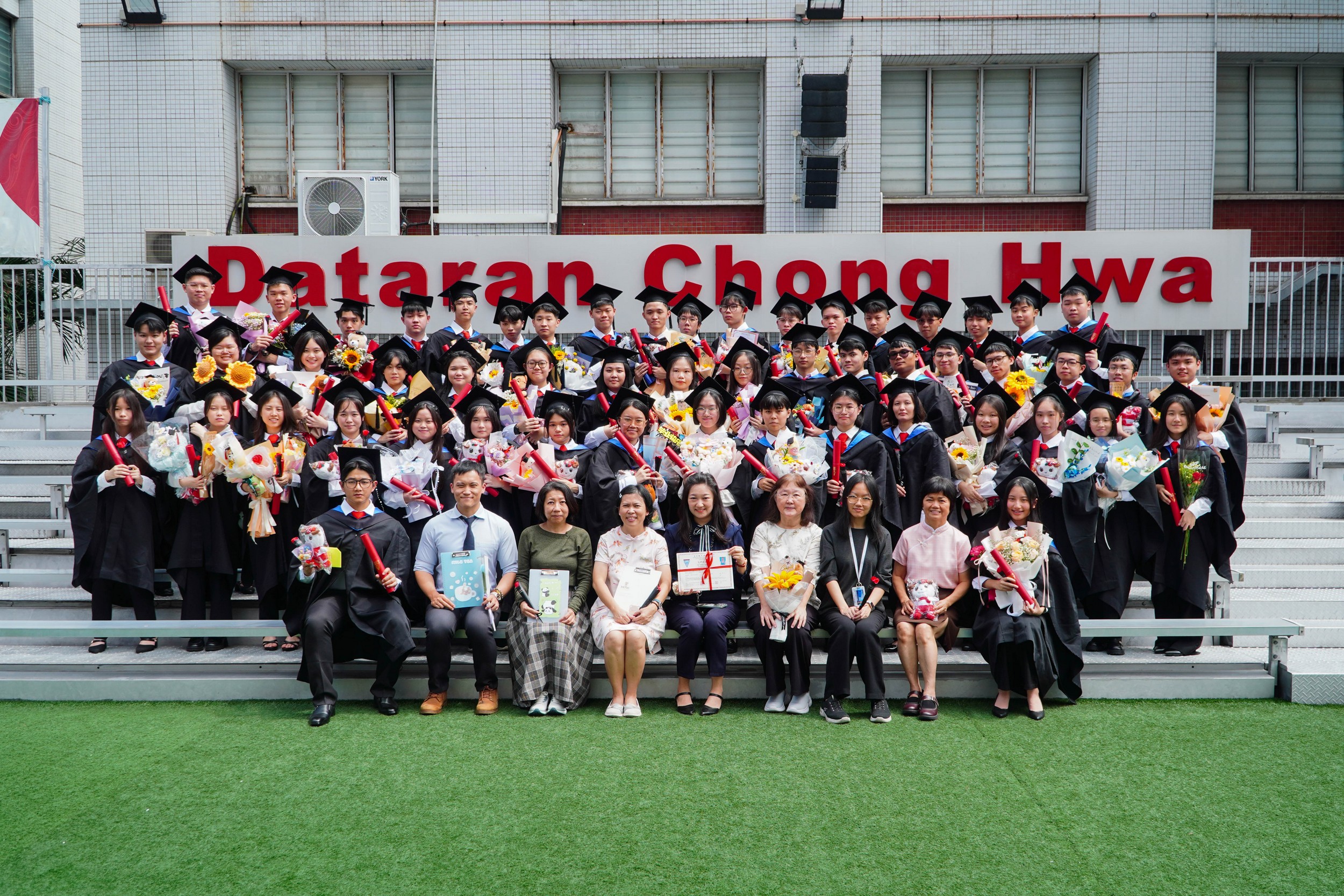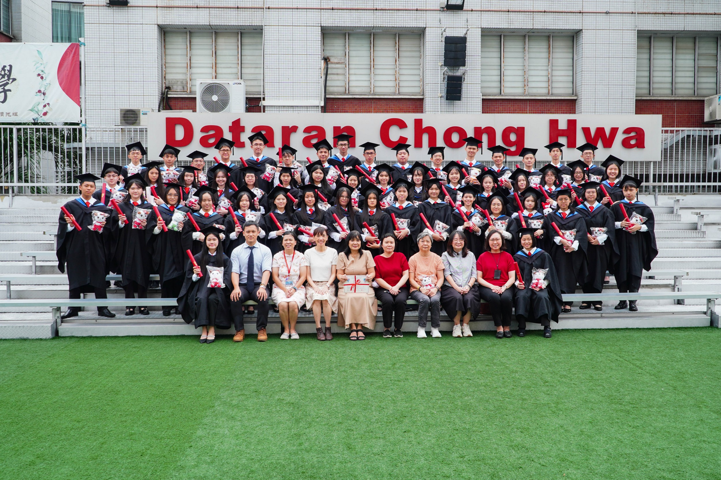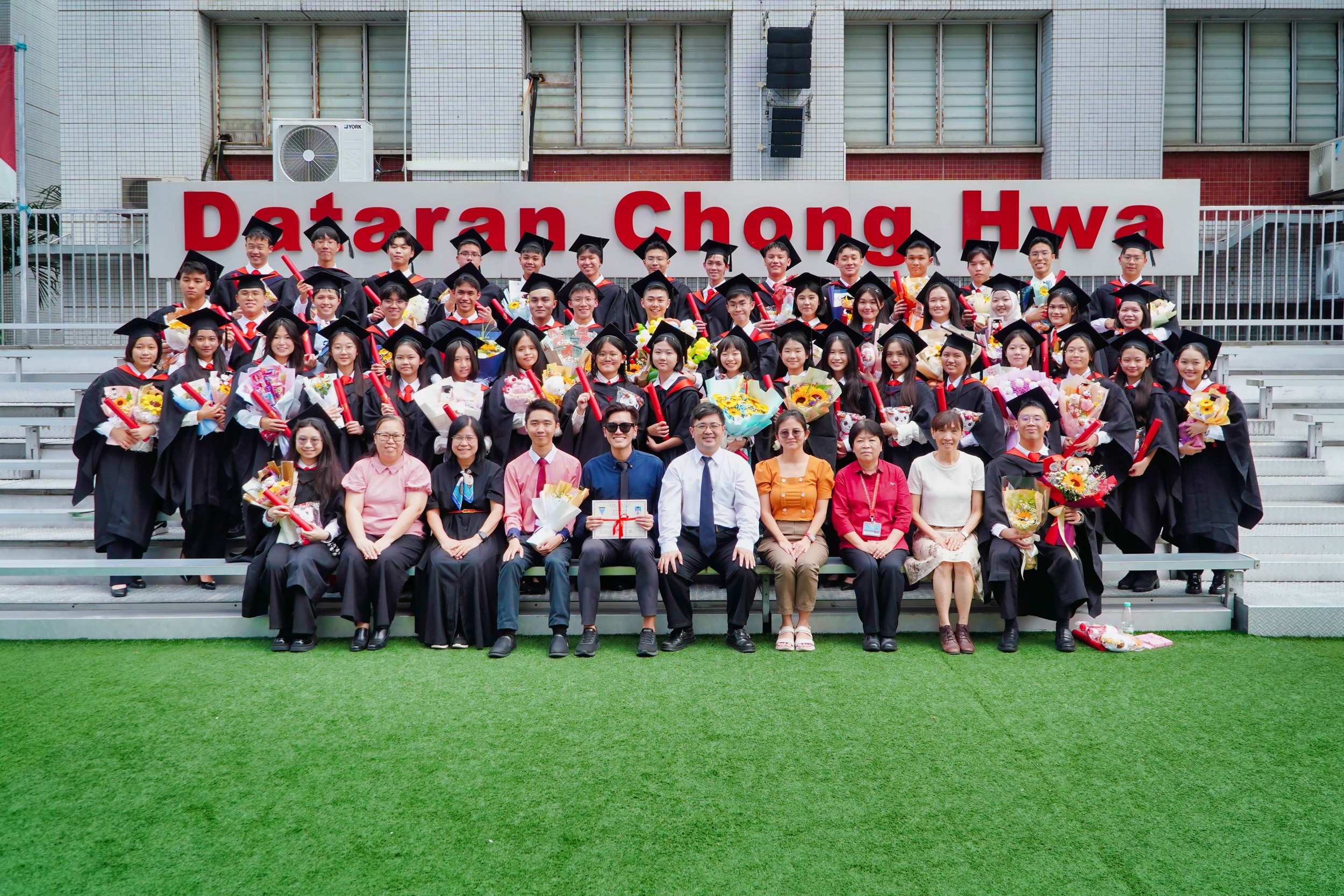 最后,本校董事长丹斯里拿督斯里林景清颁发毕业证书予每位高三毕业生,并由张梅莲校长陪同见证。来自高三理仁的陈心茹和高三商忠的黄勇翔分别以华语和国语发表毕业感言,深情感谢母校和师长六年来的辛勤付出与悉心教导。来自高一理忠的江昀芯与曾思晴则以华语和英语为毕业的学哥学姐送上真挚的祝福。此外,高三毕业生代表向母校移交RM55,500的毕业献金,作为建设发展基金。本校初二、高一与高二学生特别为毕业生献唱《稻香》和《你曾是少年》,祝愿学长学姐们毕业快乐、前程似锦。最后,全体毕业生齐声高唱今年高中毕业的主题曲《那些年的我们》及毕业歌曲《友谊万岁》,为六年的中学生涯画下圆满句点。