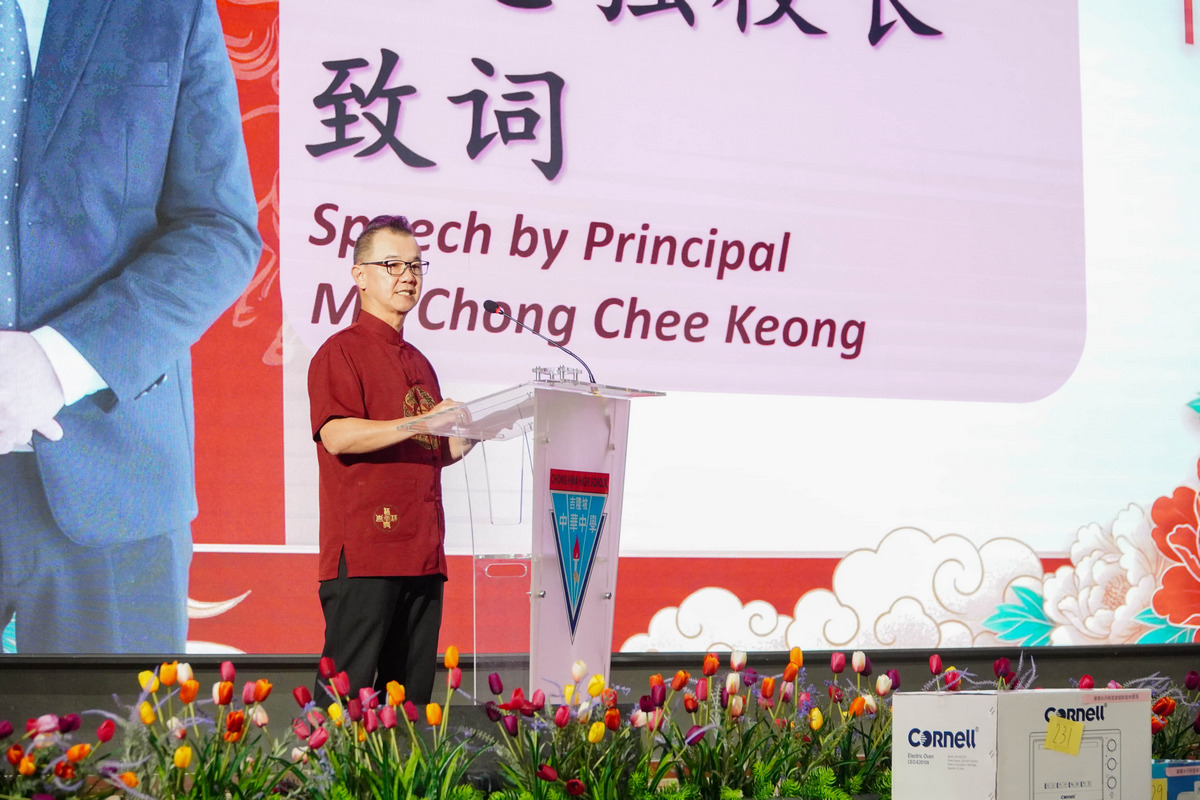 本校校长锺志强感谢董事会赞助此次新春联欢午宴。他表示,一所学校要办得好,除了教师在前线辛勤付出,董事会也在幕后给予大力支持,双方相互配合,方能推动学校稳步发展。他指出,此次新春午宴中的礼篮、电器礼品及新春红包,皆由董事会与多家企业公司热心赞助,充分体现社会各界对学校的支持与关怀。锺校长表示,隆中华近年来在各方面取得优异成绩,离不开全体教职员工与董事会的共同努力。他也期望在新的一年里,全校上下能够设立新的目标,持续提升与改善,推动学校迈向永续发展。