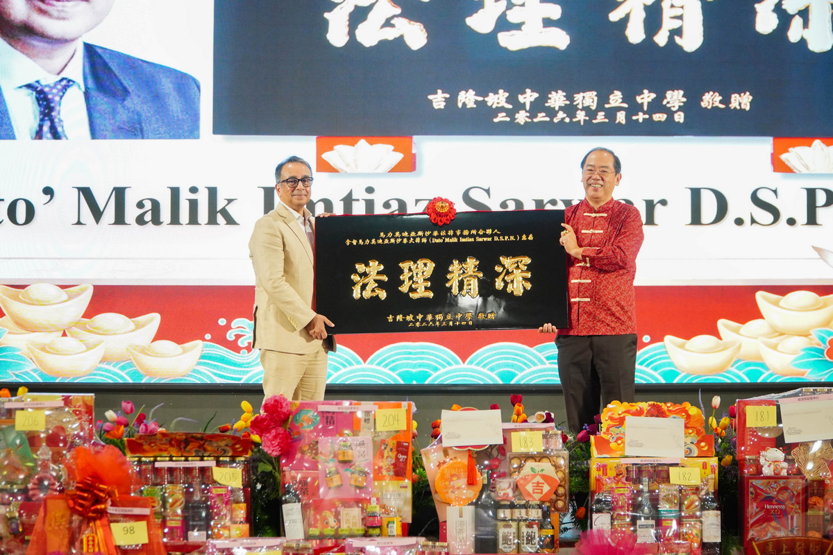 本校董事长丹斯里拿督斯里林景清在致词中,特别肯定本校董事拿督王明威律师 D.S.A.P.及拿督马力美迪亚斯沙华大律师(Dato’ Malik Imtiaz Sarwar D.S.P.N.)长期以来为母语教育所作出的重要贡献。他继而表示,民族教育能够在马来西亚稳健发展并落地生根,两位律师功不可没。在联邦法院审理华小与淡小合宪性的诉讼案件中,法院三司一致裁定,华文小学与淡米尔小学以母语作为教学媒介语符合联邦宪法,这项裁决成为我国民族教育发展历程中的重要里程碑。为表彰两位律师的贡献,本校董事长丹斯里拿督斯里林景清特别赠送纪念牌匾,以表达诚挚的感谢与崇高敬意。此外,隆中华艾美娜分校预计将于明年1月正式开办,他希望校本部的教职员工能够给予协助与支持,共同推动分校顺利开学与发展。