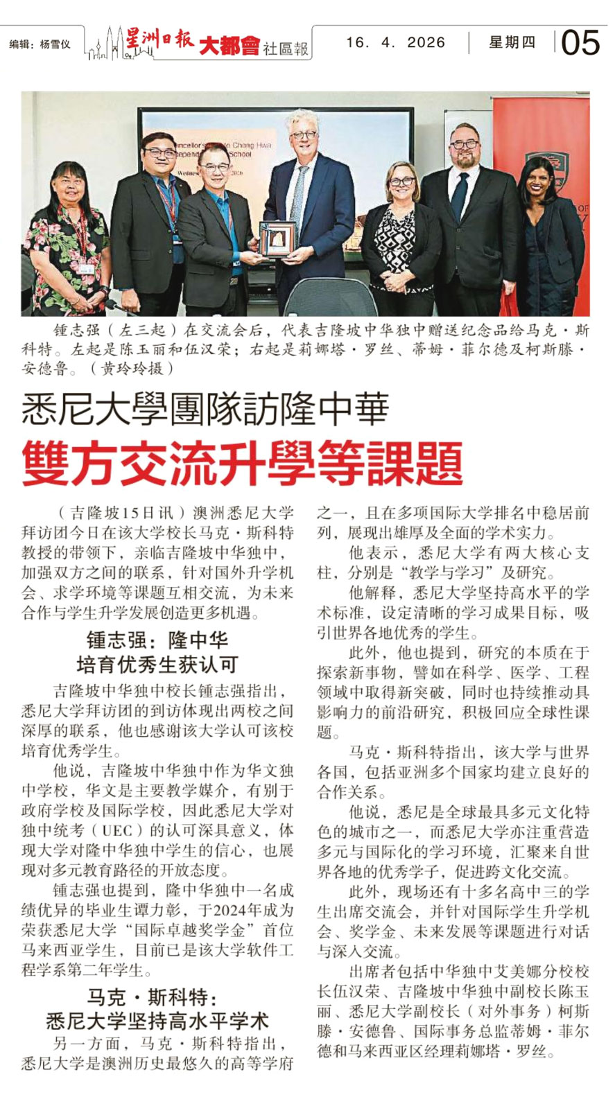 (吉隆坡15日讯)澳洲悉尼大学校长马克•斯科特(Mark Scott)教授偕同该校外联副校长柯丝汀•安德鲁斯(Kirsten Andrews)、国际处总监蒂姆•菲尔德(Tim Field)和马来西亚区域经理蕾娜塔•罗斯(Renata Rose)团队莅临本校,展开一场富有意义的交流访问,进一步促进双方在教育领域的联系与合作。