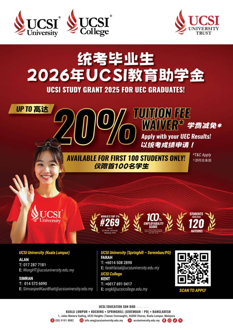 【奖学金资讯】本地UCSI大学- 2026年独中生伙伴学校特别奖学金