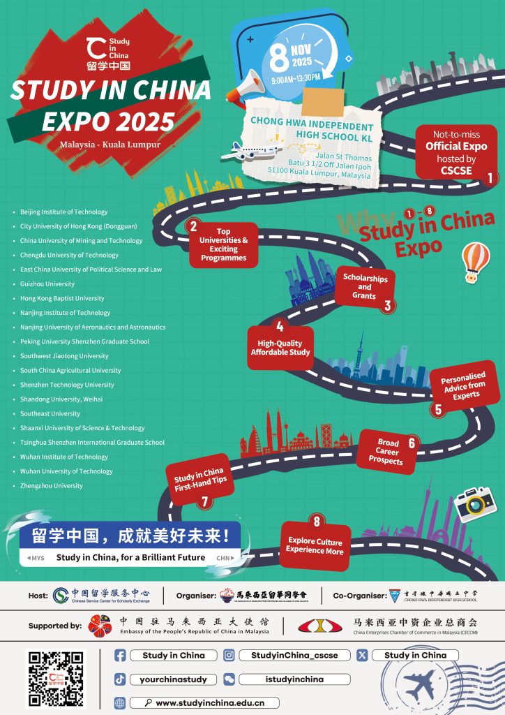 主办方:马来西亚留华同学会 协办单位:吉隆坡中华独立中学 支持单位: 中国留学服务中心、中国驻马来西亚大使馆 展览日期: 2025 年11月8日(星期六) 地点: 吉隆坡中华独立中学-光前堂 时间: 早上9点至中午1点30 分