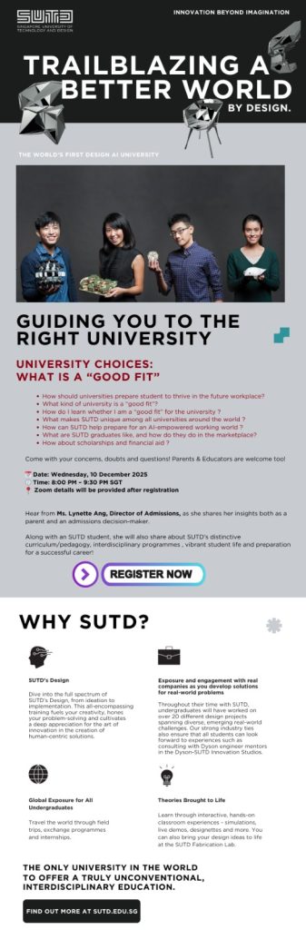 各位同学, 对于新加坡大学, NTU, NUS, SUTD 和 SMU 是四所政府全力资助的公立大学。 对于 SUTD大家了解太少, 非常鼓励有意留学新加坡的理科生出席以下说明会, 了解更多, 才能发掘更多的机会! 新加坡科技设计大学(SUTD)简介 SUTD 与 MIT 合作创校、重视创新与实做,是非常适合独中生的 科技与设计 大学。 ✨ SUTD 的关键优势: 1️⃣MIT 合作课程 :学习模式与国际顶尖同步。 2️⃣做中学、项目多:每位学生毕业前完成 20+ 实战项目,履历超亮眼。 3️⃣就业率接近 100%:科技、工程、建筑环境、AI 领域广受企业欢迎。 4️⃣独中友好:认可 UEC,重视你的能力、兴趣与项目经验,而不只看考试。 5️⃣小班教学、全球机会多:海外交换、企业实习、创业资源齐全。 非常适合不喜欢考试、有想法、喜欢把理念想法变成学习动力, 喜欢跨领域学习的你。 了解更多?马山马上马上报名以下说明会: 🌟 SUTD 线上说明会:寻找最适合你的大学! 想知道: ✔️ 什么才是 “适合你” 的大学? ✔️ SUTD 与 MIT 设计理念有何独特之处? ✔️ 如何准备未来的 AI 时代? ✔️ […]