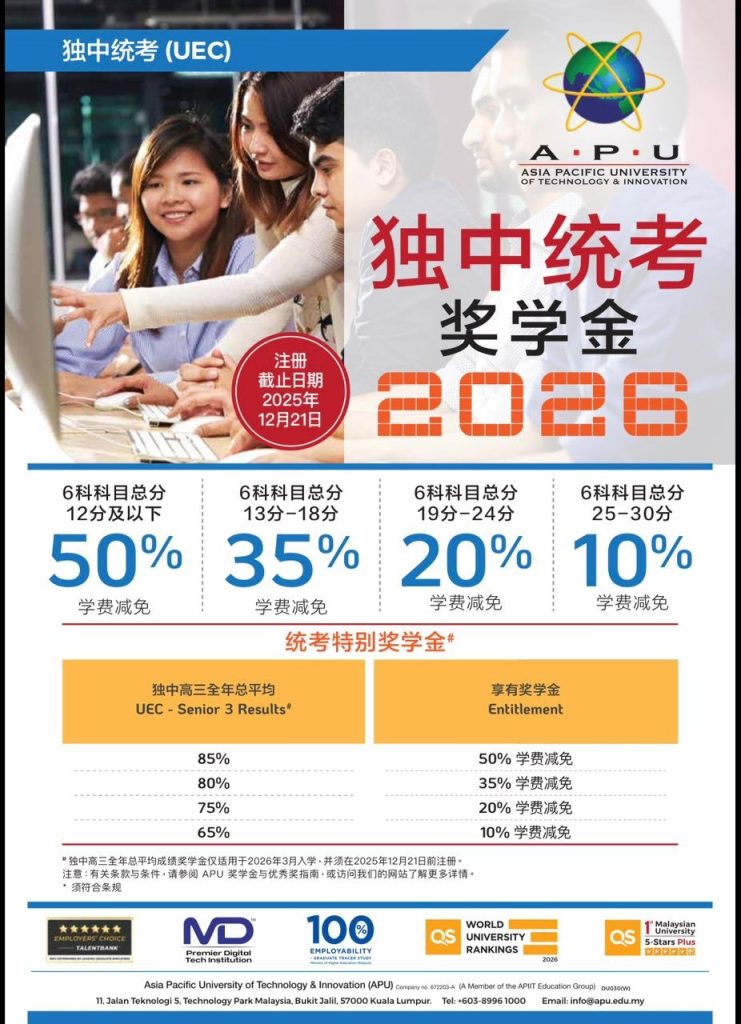 符合条件者提供 为期四年的全额学费及生活费资助 ,支持学子远赴 中国厦门大学攻读汉语言本科(教育方向)专业课程 。 自即日起,奖学金申请正式开放。截止日期: 31/3/2026 有兴趣同学可以前来升学处询问并提交申请表格给相关单位。 升学及国际事务处