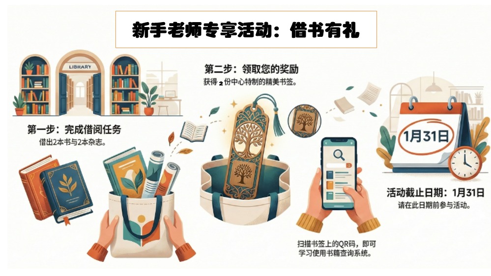 只要从未借书的老师来 开通户口 完成步骤1,就可获得2个书签。
