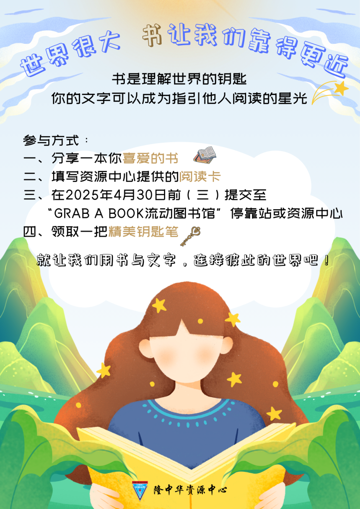 书香为伴,花香致谢 Books & Blooms 为了响应“世界阅读日”,本中心于4 月23日举办“书香为伴,花香致谢Books & Blooms”教职员专属活动。 活动当天,凡借书并填写建议卡的教师,皆可获赠一朵玫瑰。本中心希望以花香传递谢意,感谢老师们长期以来对阅读推广与本中心的支持,也鼓励更多人积极参与资源中心的建设与成长。当日所有玫瑰悉数送出,此活动也在满室书香与花香中圆满结束。 世界很大-书让我们靠得更近海报 书香为伴,花香致谢 Books & Blooms 凡借书并填写建议卡的教师,皆可获赠一朵玫瑰 浏览次数: 7 申请场地日历 There are no upcoming events.